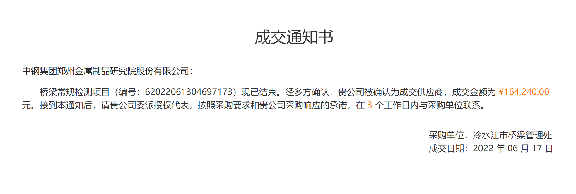 摘要:中鋼集團(tuán)鄭州金屬制品硏究院股份有限公司中標(biāo)湖南冷水市橋梁常規(guī)檢測(cè)項(xiàng)目